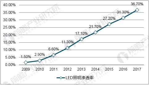 近年来,全球LED商场高速增加,已逐渐代替白炽灯、荧光灯等其他照明光源,渗透率继续快速进步,据相关数据闪现,2017年全球LED渗透率抵达36.7%,较2016年上升5.40%。